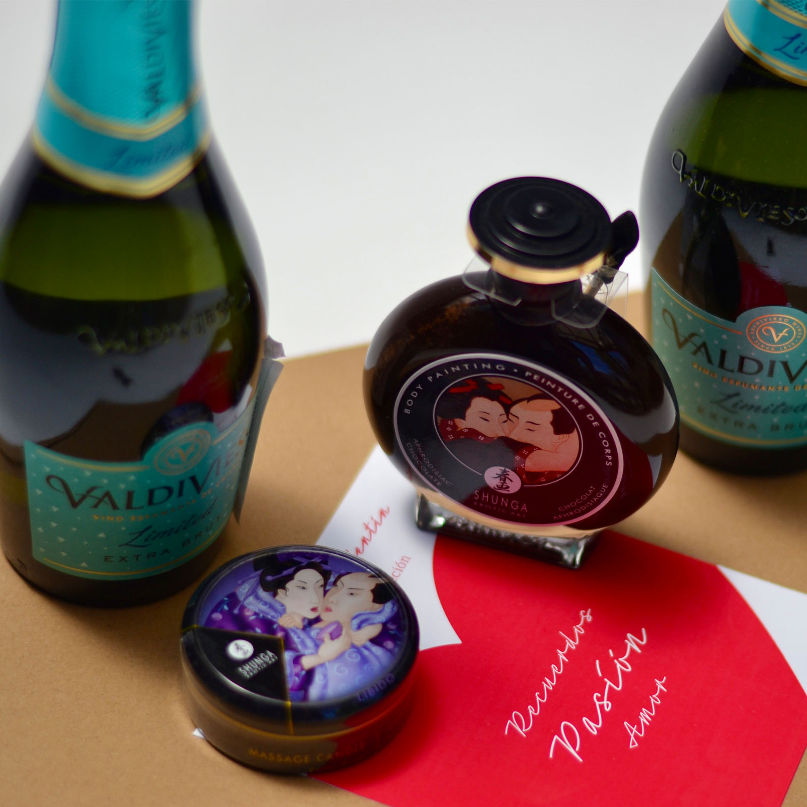 Kit San Valentín, incluye pintura corporal comestible, vela aromática más 2 Espumantes Brut Limited 375cc. Incluye tarjeta con mensaje personalizado.